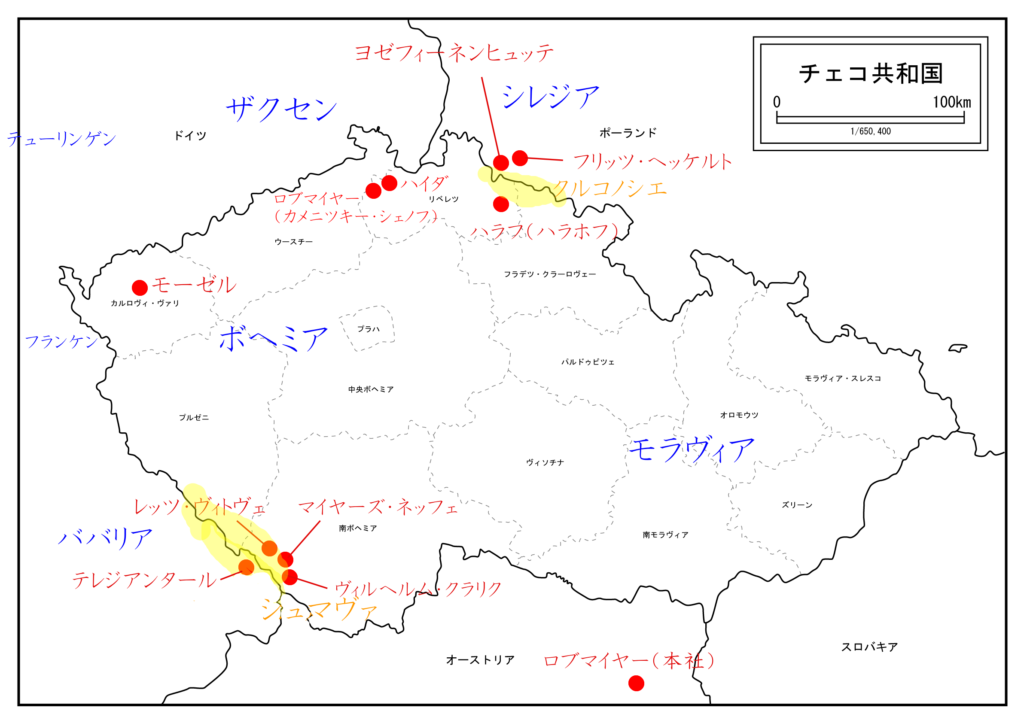 ボヘミアは現在のチェコ共和国の西部中部地方にあたる地域です。この地域は歴史的には複雑で、国名も何度も変わってきた地域です。日本では印象の薄い地域かもしれませんが、ボヘミアンガラスが栄えた18世紀は神聖ローマ帝国の一部であり、ガラス製造の先進国でした。ボヘミアは山脈に囲まれ、豊富な森林資源があります。その森林資源を利用してガラスが製造されました。特に南西部(ドイツとの境)と北部(シレジアとの境)でガラスが盛んに製造されました。