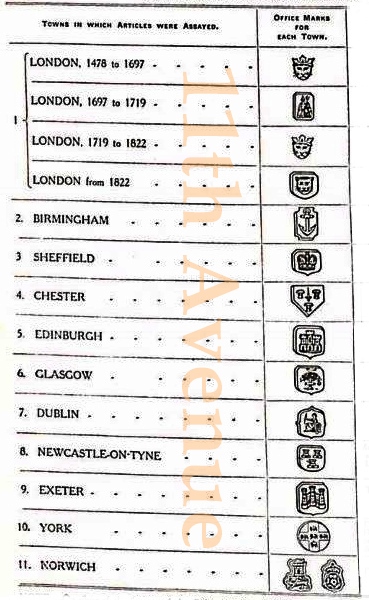 イギリスの刻印はいくつも押されます。それぞれに目的があり、また時代によってもことなります。以下例です。