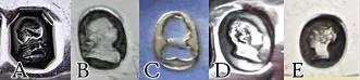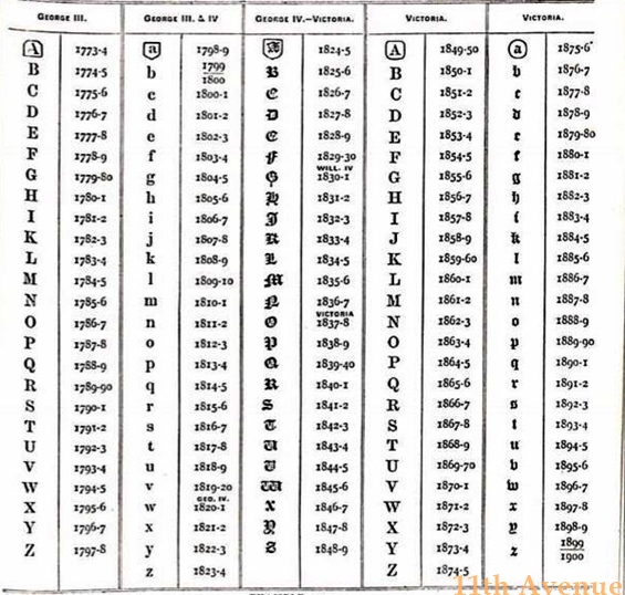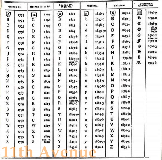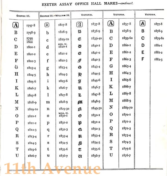 C – デイトレター年代別の刻印。書体や囲いの形、アルファベットが一年一年異なり、それにより年代を特定できる。アッセイオフィスによっても異なる。古いものには免除規定により押されない場合もある(例3)。