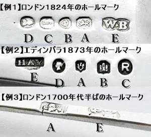 B – アッセイオフィス(Assay Office,検査機関)の刻印。それぞれの地域によってことなる刻印が押される(下記アッセイオフィス参照)。ロンドンのみ古いものは免除規定により押されないものある(例3)。