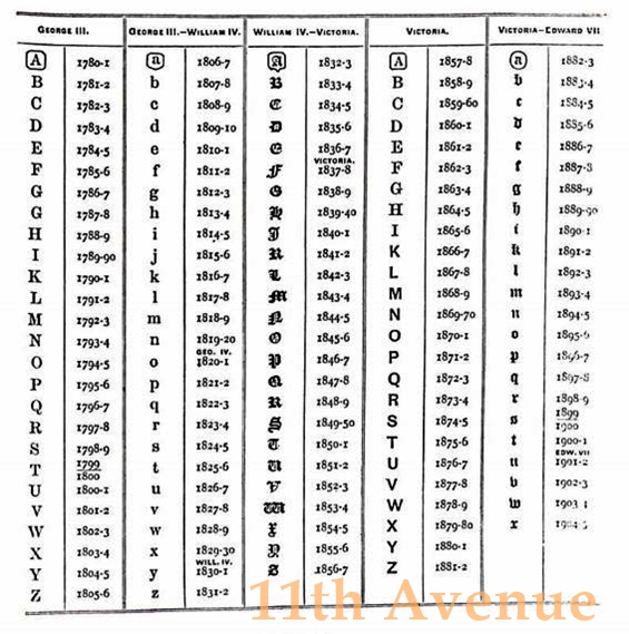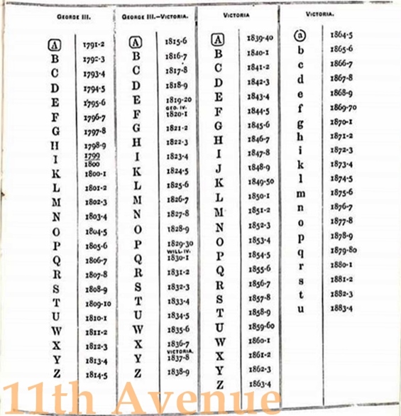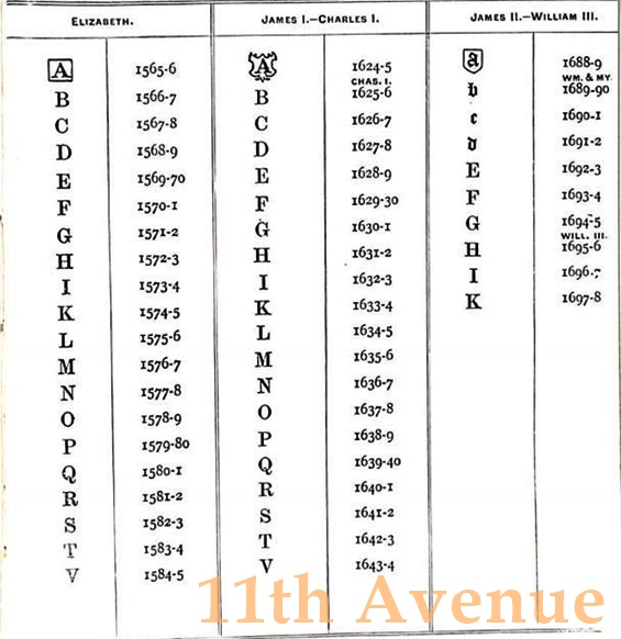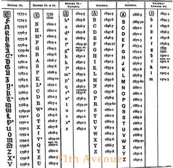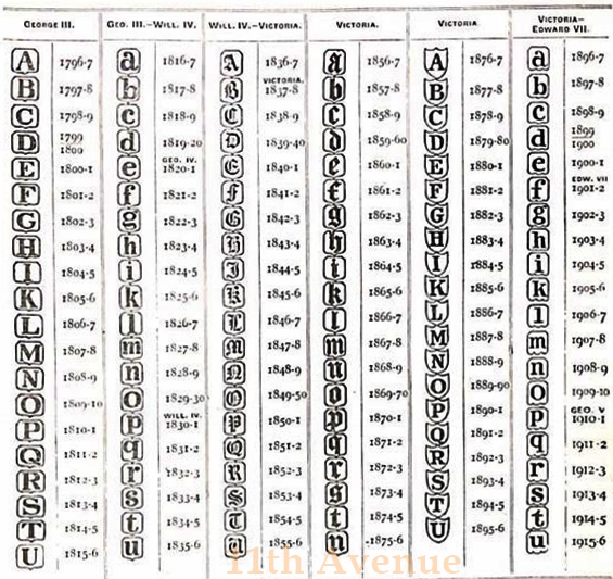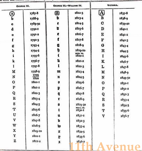 検査された年ごとの刻印が押されます。書体や枠の形に変化をつけることで区別されています。同じ年のものでもアッセイオフィスによって異なる刻印になります。これは現在まで続いています。このデイトレターが変更されるのは1659年までは5月19日、1660年から1974年までは毎年5月30日(29日とも)に変更されたとされています。1975年以降は1月1日に変更されます。例えば1813年の刻印であれば、正確には1813年5月30日~1814年5月29日までを意味します。