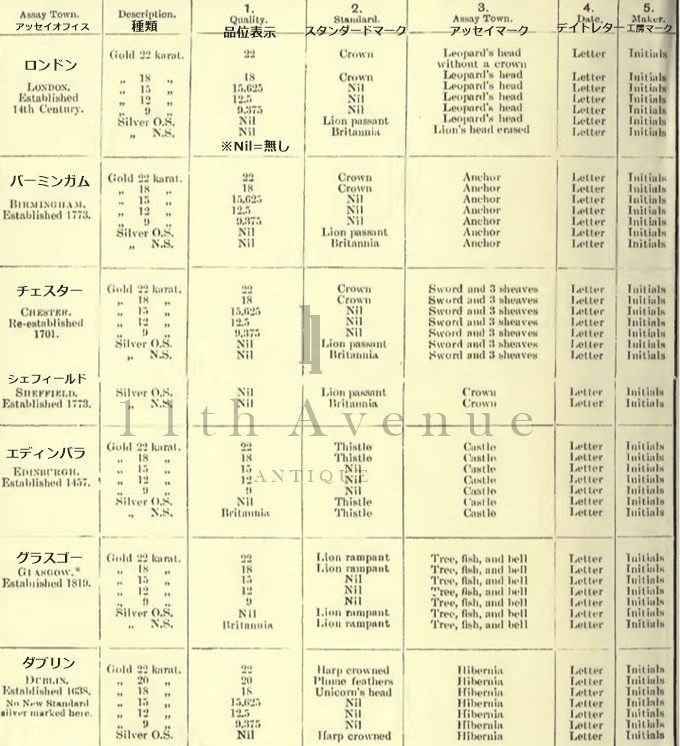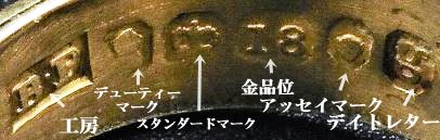 ★上記基準が正式に認められる以前から当時より低い基準での制作が行われていました。ただそれは「金製品」とはみなされていないため刻印は不要でした。例えば15金がスタンダードとして採用されたのは1854年からですが、それ以前から15金での製造はされていました。ただ、1854年以前は15金は「金製品」としての基準(最低18金)を満たしていないため、そらは「金製品」の扱いではなくホールマークは入れられなかったと推察されます。そしてそれに対応するため基準の引き下げを決めたと考えられます。
