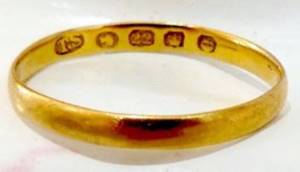 ウェディングリングヴィクトリアンのウェディングリング。正式なホールマークが刻印されている。この時代、シンプルなウェディングリングには必ずホールマークを押さなければならなった。