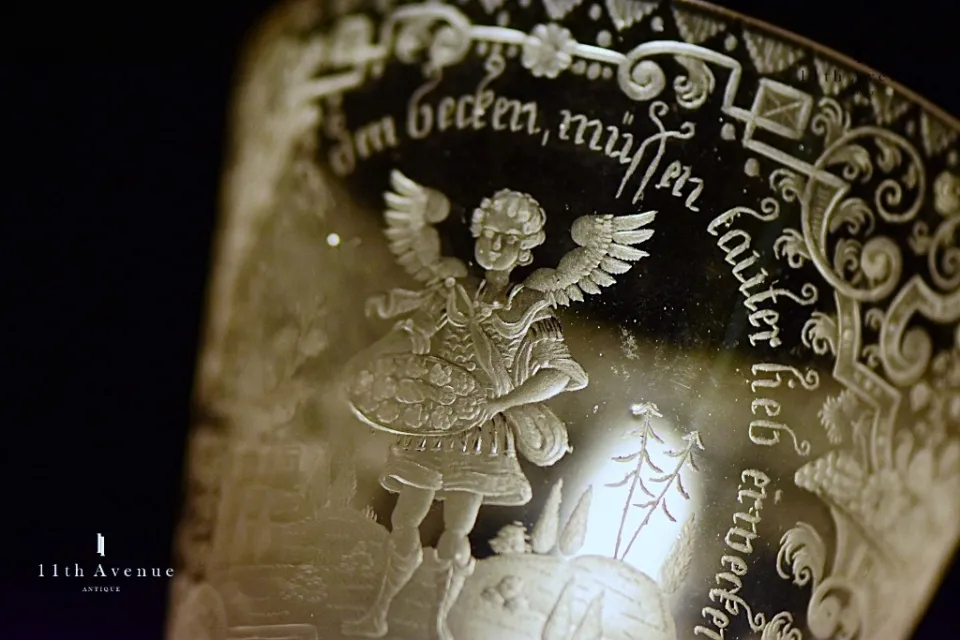 シレジアのエングレーヴィングによるデザインは狩猟文や貴族風景など多少の傾倒があるものの、図案が同じものというのがほぼなく、それは個々の注文に従って製作されたものであるということが推察できます。このグラスに描かれているのは「結婚」と「出産」をテーマにした2つの図案で、やはり注文品であろうと考えられます。片面には2羽の鳥が描かれ、上部に「Dass vergnugen da nicht fehlet wo sich lieb mit treu vermahlet」(愛と誠実さがあれば、喜びとともにある)と彫られ、もう片方には赤子を抱えた天使と、「Öolche fruhte auss den becken , mussen lauter lieb erwechken」(早く生まれ、愛を育まなければならない)と彫られています。